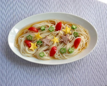 工夫次第で色々な盛り付けが楽しめます。星形は型で抜くともっと手軽です。減塩の為に麺つゆは残しましょう。