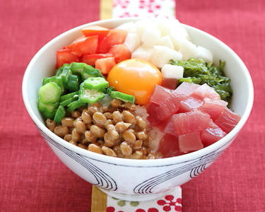 食欲のない時でもパクパクっと食べれてしまう爆弾丼!オクラやヤマイモ、メカブのネバネバ成分は血糖値の急激な上昇を抑えます。また、マグロにはダイエット中に不足しがちな鉄を豊富に含まれています。疲れやすさや夏バテが気になる人におすすめのどんぶりです。