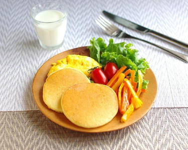 豆乳パンケーキのお食事プレートです。オムレツはカロリーを抑える為、レンジでノンオイルで作ります。休日の朝にカフェ気分でゆったりいただきましょう。