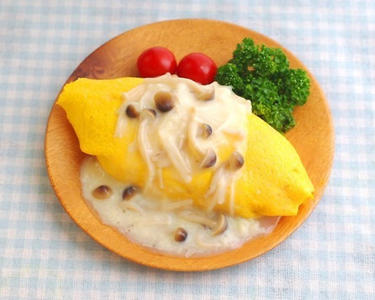 食物繊維たっぷりのきのこを使ったオムライスです。さっぱりした豆乳クリームでいただきます。