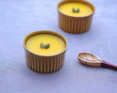 器にいれて冷蔵庫で冷やし固めてできあがり。お好みでかぼちゃのタネやハーブを飾る。