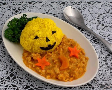 ジャックオーランタンの形をしたターメリックライスと、かぼちゃが溶け込んだやさしい味のキーマカレーです。ハロウィンパーティーにどうぞ!