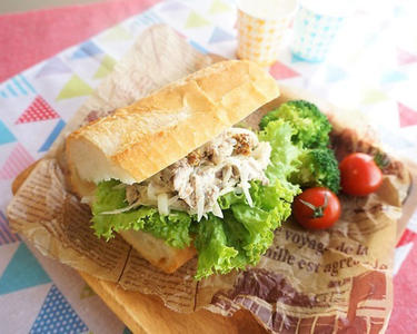 フランスパンに切れ目を入れ、水けをよく拭き取ったリーフレタスをちぎって挟み、②と粒マスタードをのせ、ミニトマトと茹でたブロッコリーを添える。