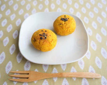 2等分に分け手で軽く丸めて成形し、トースターで表面に軽く焼き色をつけ黒ごまを飾る。