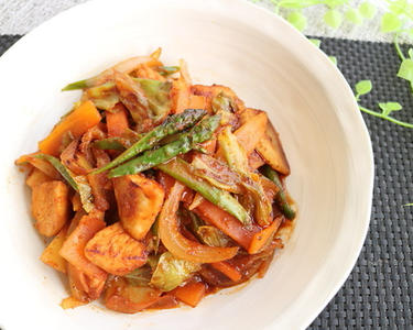 ★で調味し、お皿に盛り千切り人参と薄く切った長葱、黒ゴごまを飾る。