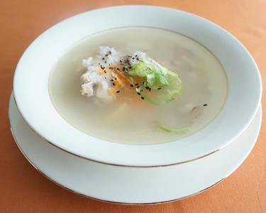 サムゲタン(参鶏湯)は丸どりにもち米や高麗人参、にんにくやなつめなどを詰めて長時間煮込む韓国料理です。
