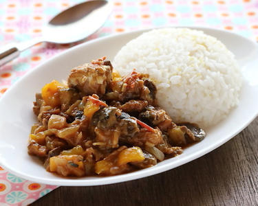②にサバ缶とカレールーを加えて弱火で煮込み、ご飯と一緒に盛り付けて、出来上がり。