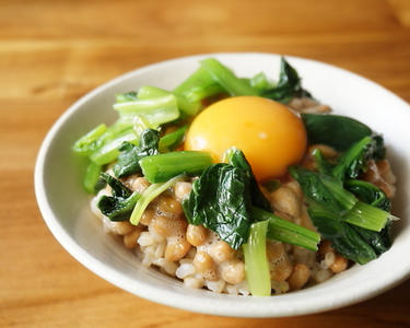 玄米ご飯を茶碗に盛り、納豆を盛り②をのせ、中央に卵をのせる。
