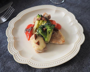 豚ももに塩・こしょう、薄力粉をまぶす。ブロッコリーは固めに茹でる。赤パプリカは横半分に切る。アーモンドは砕く。