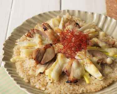 ②に①を薄く切ったもの、③の長葱を乗せ、溶けるチーズを散らしトースターでチーズが溶けるまで焼く。