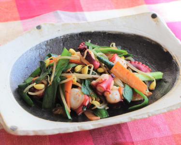 たことニラを使ったピリッとした辛さがポイントの炒め物です。たこは低脂質・高たんぱくなヘルシー食材。そしてニラはカロテンやカルシウム、カリウムなどが豊富な栄養価の高い食材です。血行をよくしたり胃腸の働きをよくする働きがあるので風邪予防にもおすすめ。