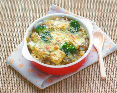 肉の代わりにお豆腐を使った焼きカレーです。一人分のカレーはレンジで手軽に作ることができ、炒め油も省略できるのでカロリーオフにつながります。