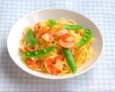 えびを加えて色が変わったらスパゲティを入れて混ぜ、皿に盛り付け、スナップえんどうを飾る。