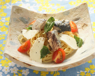 ①を器に盛り、サバの水煮缶、モッツァレラチーズ、バジル、4等分に切ったミニトマトを飾り、黒こしょうを振る。
