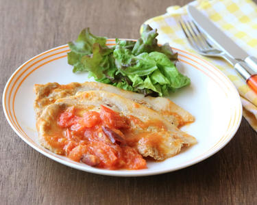 豚肉に塩とコショウで軽く下味をつけ、片栗粉をまぶす。トマトはざく切りにする。