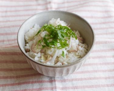 ごはんにみょうが、しらす干し、ごまを混ぜて茶碗に盛る。大葉を添えて出来上がり。