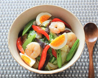 加熱時間が少ない野菜を使っているので、長く炒めすぎると野菜やエビが縮んでしまうので注意してください。
