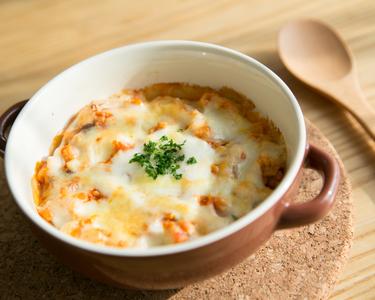 市販のホワイトソースやミートソースで作ることもできますが、カロリーや塩分量が多くなるので、あわせるおかずを脂質や塩分を控えたものにされるといいですよ。