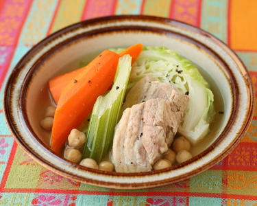 ポトフは、肉にしっかり下味をつけておくことで味わい深い仕上がりになります。豚肉からしっかり旨味をとり、ひよこ豆で美味しくたんぱく質をとる。たっぷりの野菜も美味しくいただけるバランススープです。