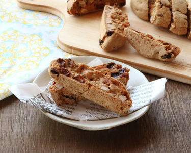 ビスコッティは2度焼きしてかたく仕上げた焼き菓子です。バター不使用だから罪悪感なく食べられます。アーモンドやレーズンで、ビタミンや食物繊維の補給にもぴったりです。