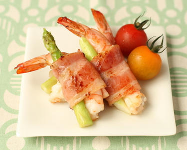 えびは尾を残して殻をむいて背わたをとり、腹に3ヶ所切り目を入れて身をのばす。ベーコンは長さを半分に切って小麦粉を薄くふる。アスパラガス1本、えび1尾をベーコンで巻く。(同様に残りも巻く)
