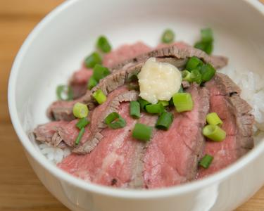 ローストビーフを丼にしました。もも肉を使っているので低脂肪、高たんぱく質でヘルシーに楽しめますよ。
