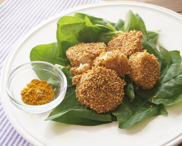 実はカルシウムが豊富に含まれるごまと、脂肪の量が少なく、たんぱく質がしっかり摂取できる帆立貝を合わせたひと皿です。ビタミンKを含むサラダほうれん草と、カレー塩でサラダ感覚でいただけるおかずです。