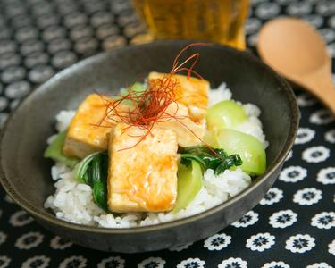 あっさりとした豆腐に、しょうゆと砂糖の甘辛だれがからむ、ご飯がすすむ丼です。野菜をあわせることで、より栄養バランスがよくなりますよ。
