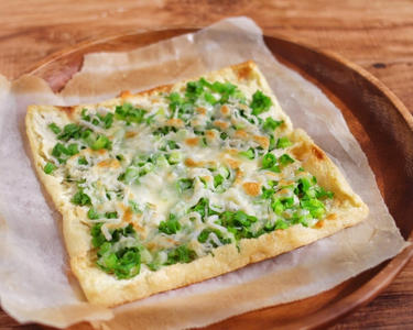 油揚げを使ったヘルシーなピザです。たっぷりのネギとチーズが相性抜群で、食べ応えもアップさせてくれます。油揚げとチーズからカルシウムもしっかりとれます。