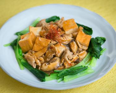 フライパンに油をいれ、豚肉、椎茸、厚揚げを炒め、皿にとっておく。