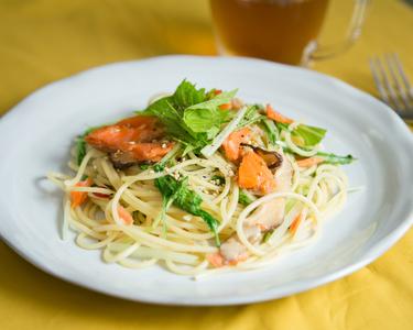 鮭と水菜の和風パスタ。水菜は火が通りやすいので、調理の最後にさっと混ぜ合わせましょう。