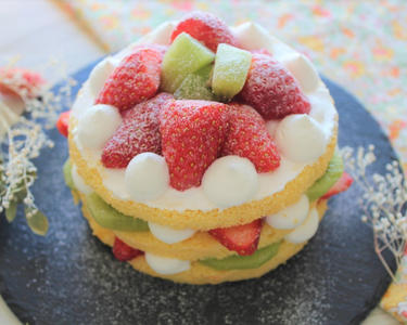 側面をデコレーションしないネイキッドケーキは、使用するクリームの量が少ないので脂質を抑えた分、低カロリーです。ケーキの層に果物をたっぷり飾ることで彩りが良く、見た目が華やかなホールケーキになるよう仕上げました。 誕生日はもちろん、クリスマスやバレンタインデーなどのイベントにもぴったりですよ!