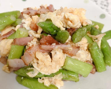 ベーコンから油が出たら中華だしとアスパラガスを入れる。