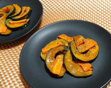 かぼちゃとにんじんにガーリックバターソースを塗り、クッキングシートを敷いた天板にかぼちゃとにんじんを重ならないように並べ、200度のオーブンで10分~15分ほど焼く。