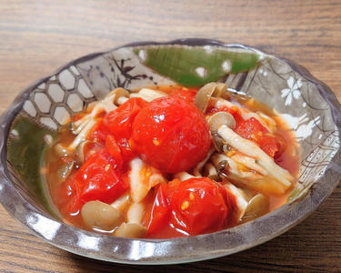 包丁もまな板も使わず、レンジのみで作れる超時短煮物です。火を通したトマトはリコピンの吸収率も上がると言われています。白だしの強い旨味とトマトの酸味をしめじが吸ってくれるので、ぜひ試していただきたい一品です。
