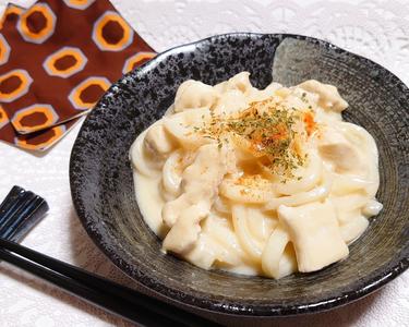 話題のシュクメルリを豆乳で大幅にカロリーカットし、洋風うどんにしました。まろやかでコクがあって、後を引く味です。シュクメルリのソースはアレンジの幅が広いので、パスタに絡めたり、パンにつけて食べたりしてもおいしいです。