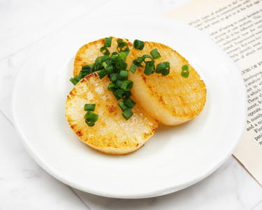 バターとにんにくを効かせた香ばしい大根ステーキです。レンジであらかじめ加熱しておく事で時短につながります。大根には便通を整える食物繊維や抗酸化作用のあるビタミンCなどの栄養素が含まれています。青ねぎをトッピングする事で彩りが良くなりますし、緑黄色野菜も一緒に摂る事ができ、栄養価がアップします。