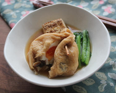 巾着を器に盛り付け、焼き豆腐とこまつなを添える。煮汁をかければ完成。