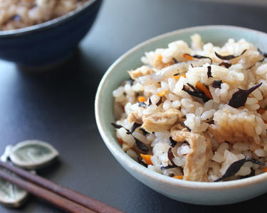 炊飯器に米、ひじき、にんじん、油揚げ、こんにゃくを入れ、水とめんつゆ、酒を入れて普通炊きで炊く。茶碗に盛り付ければ完成。