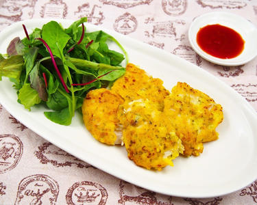 フライパンにオリーブオイルを熱し、卵液をつけた鶏むね肉を焼く。 フライパンに蓋をして弱火~中火で約5分間焼き、中まで火を通す。 中まで火が通り片面に焼き色がついたらひっくり返し、反対にも焼き色がつくまで焼く。