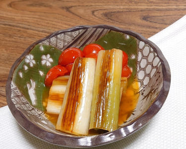 ネギはカロリーが低く、ダイエット中でも安心して食べられる野菜の一つです。ごま油でじっくりと焼き目をつけてから煮た長ネギのおいしさは格別です。長ネギやミニトマトでカリウムやビタミンAなど栄養も豊富。煮汁はしっかりと煮切った方が保存が利きます。