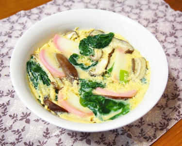 かまぼこ、しいたけは薄切りにし、小松菜は茹でて食べやすい長さに切っておく。