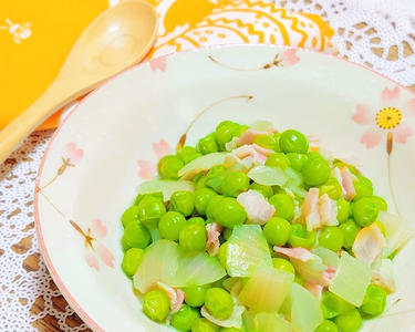 フライパンにたまねぎとベーコンを入れ、中火で煮る。たまねぎが透き通ってきたらグリンピースを入れる。