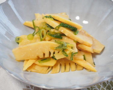 たけのこは5mm幅程度の薄切りにする。 ねぎは小口切りにする。