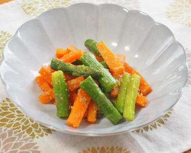 ボウルに合わせ調味料Aを混ぜ合わせておき、加熱して柔らかくなったアスパラガスとにんじんを入れて和える。 器に盛り付けて完成。