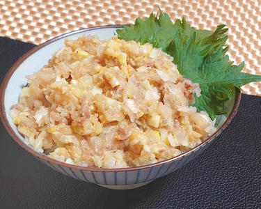 ご飯の上に、2と、洗って水気を拭き取った大葉をのせて出来上がり。