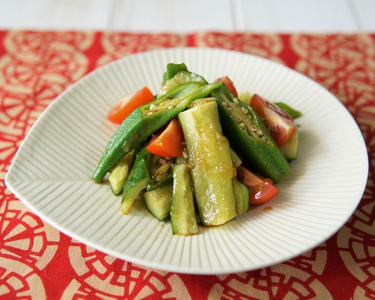 オクラには食物繊維が含まれるので、整腸作用や、血糖値を緩やかに上昇させてくれる働きが期待できます。また、野菜に多いカリウムは塩分や老廃物の排出に役立ちます。夏野菜を取り合わせ、粘りのあるオクラにシャキシャキ食感のきゅうり、ジューシーなトマトが中華だれに良く合う夏の味!
