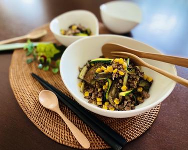野菜とお肉がしっかり食べれる一品です。ズッキーニとなすを縦に薄く切ることで食感を楽しみつつ、ひき肉に絡みやすくなりますよ。ズッキーニはむくみ予防にも一役買う、カリウムという栄養素が豊富に含まれています。