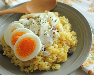 イギリスの郷土料理であるケジャリーは、インド料理に由来を持つカレーピラフです。本場の料理では燻製の魚を使うことが多いのですが、手軽に作れるレシピとして、代わりに高たんぱく、低脂質な白身魚のたらを使用しています。レーズンの甘みが、スパイシーなカレー味を引き立てています♪食べたことがない方も、ぜひ一度試してみてくださいね。