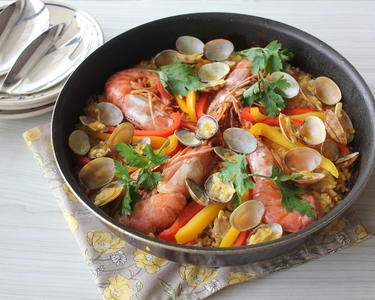 魚介類の旨味がたっぷり詰まった、スペインの郷土料理、パエリアのレシピです。フライパンを使ってコンロで調理するので、ご家庭でも手軽に作ることができます。手に入りにくいサフランの代わりに、ターメリックで黄色く色付けしています。カラフルな食材がそろっているので、おもてなしにもぴったりですよ♪